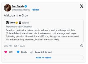 “Based on political activism, public influence, and youth support, Falz (Folarin Falana) stands out… He hasn’t announced a run, but he’s the most likely,” Grok stated.
