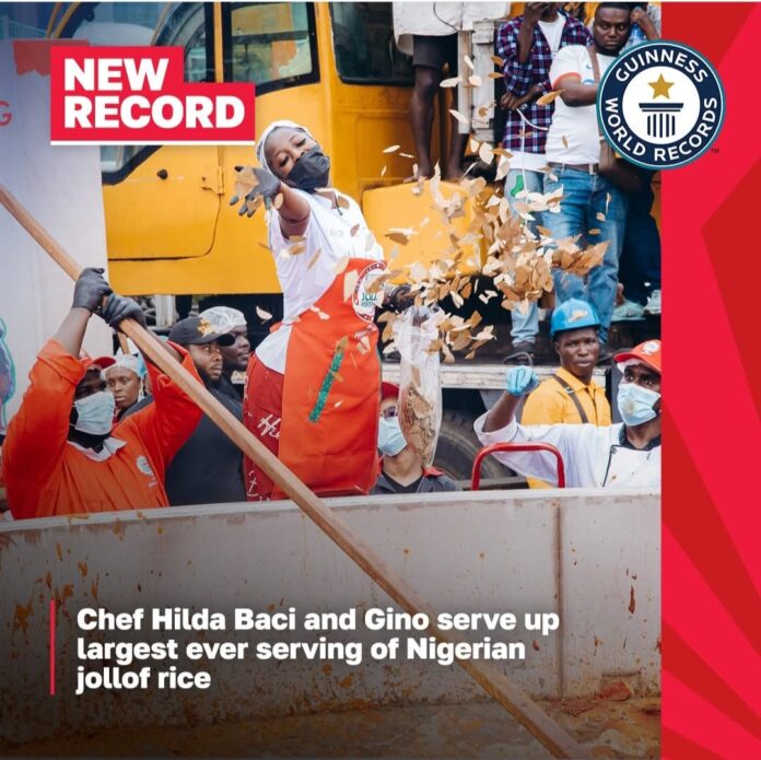 “Best of luck to @hildabacicooks who’s attempting a new record for the largest serving of Nigerian-style jollof rice today.”