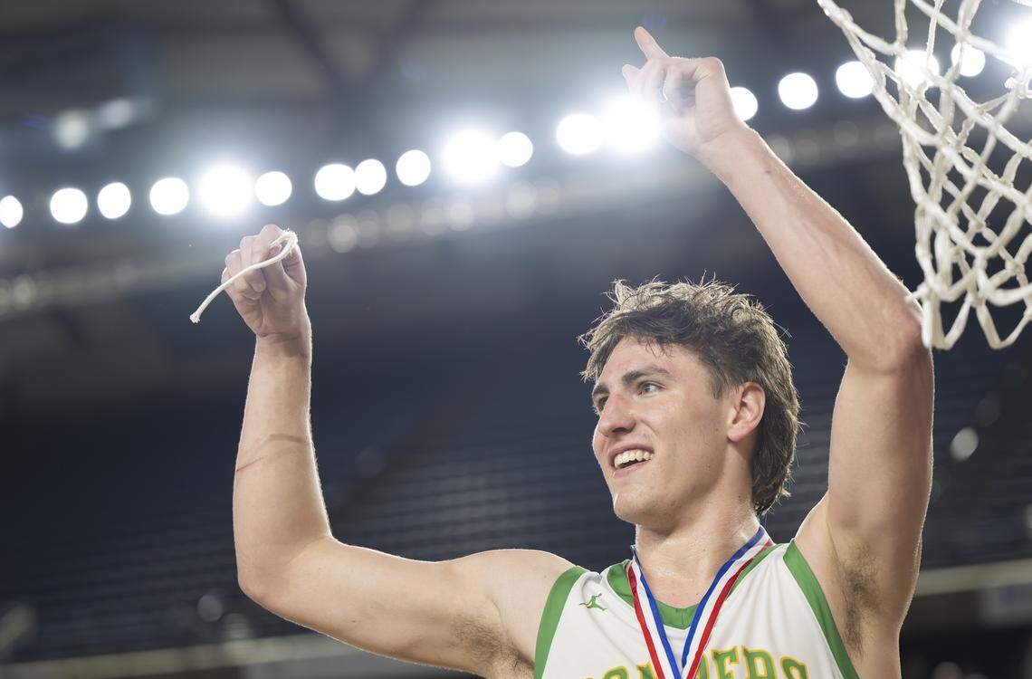 Richland guard Landen Northrop (1) reacts to successful the Boys 4A Order Tournament Championship Gonzaga Prep on the Tacoma Dome, on Saturday, March 7, 2026, in Tacoma, Wash.